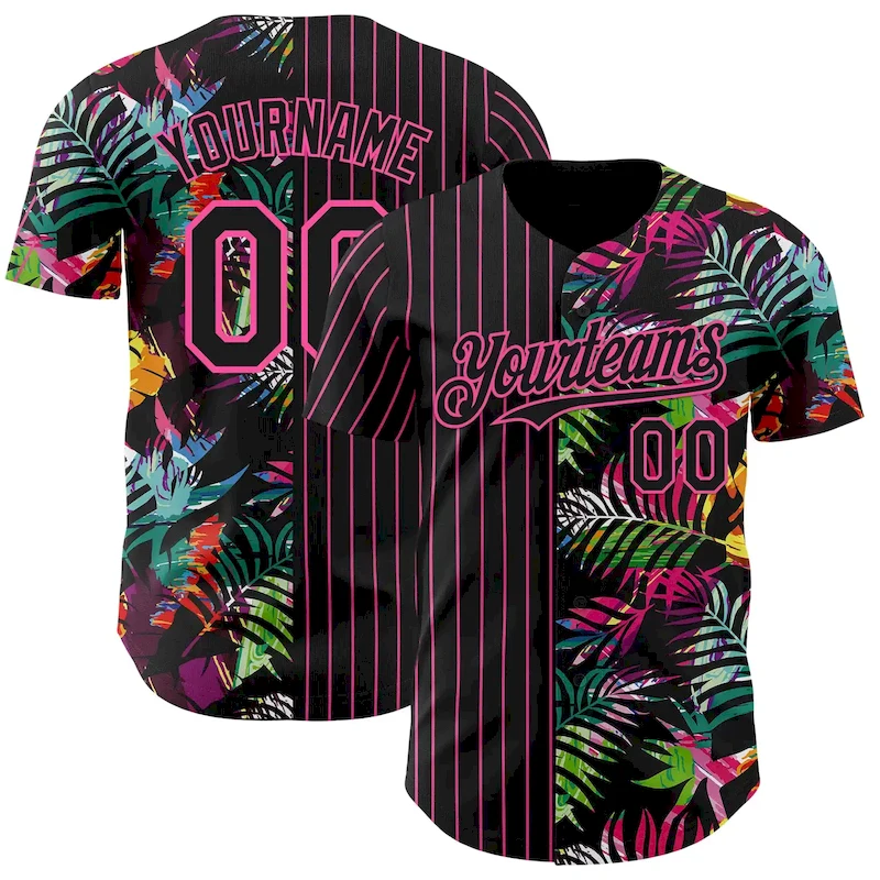 Custom Black Pink 3D Pattern Design Pinstripe Tropical Palm Leaves Authentic Baseball Jersey