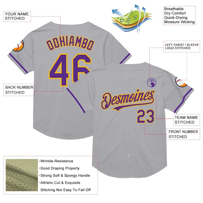 Each ® tailored baseball jersey is meticulously personalized with the following features:Material: 100% PolyesterJersey with Stitched name & numberMoisture-wicking fabric has spongy handle, good draping property and elasticity as well as good dimensional stability and wrinkle-resistanceBreathable & Quick-DryingAthletic Cut & Exquisite stitching not easy to fall offRounded droptail hemTagless Collar offers clean comfortV-Neck with Rib-Knit trim aroundShort SleeveMachine wash, Do Not Tumble DryNon-alcoholic Available For Wiping or WashingImported