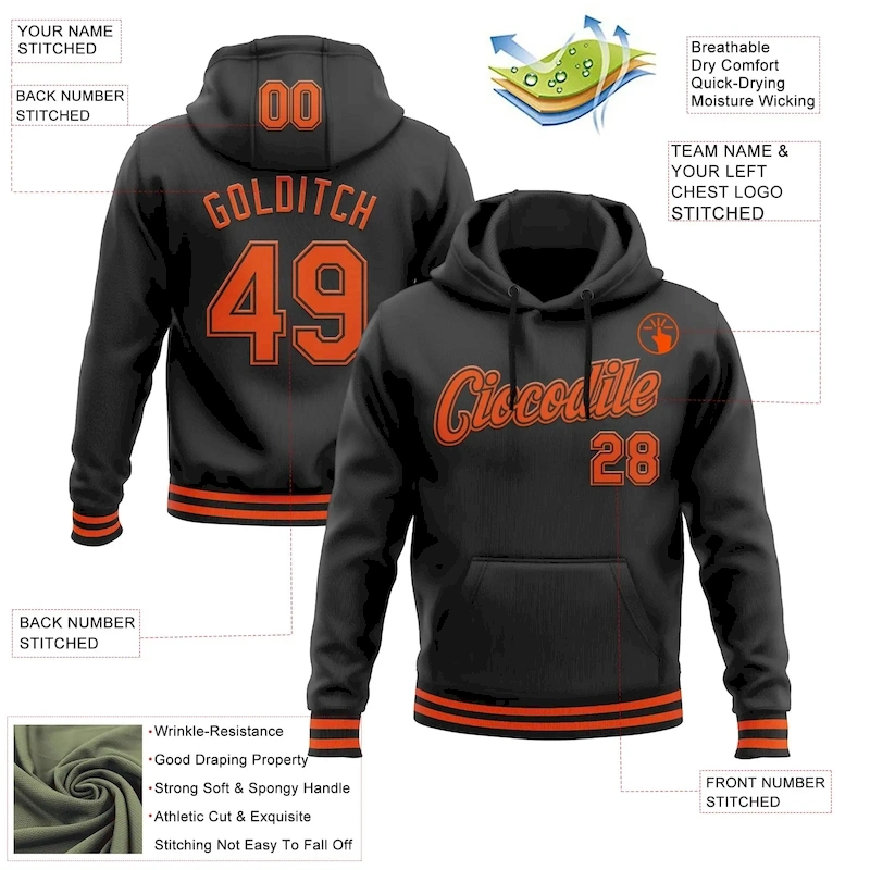 Each ® tailored pullover sweatshirt hoodie is meticulously personalized with the following features:Material: 100% polyesterStitched team or player name and numbersTechnology fleece fabric helps to manage your body’s natural heat to keep you warm Breathable & quick-drying; exquisite stitching not easy to fall offMoisture-wicking fabric has spongy handle, good draping property and elasticity as well as good dimensional stability and wrinkle-resistanceRib-knit cuffs and waistbandHood with adjustable drawstringMidweight hoodie suitable for moderate temperaturesTagless collarMachine wash, tumble dry low (natural air drying recommended)ImportedNon-alcoholic available for wiping or washing
