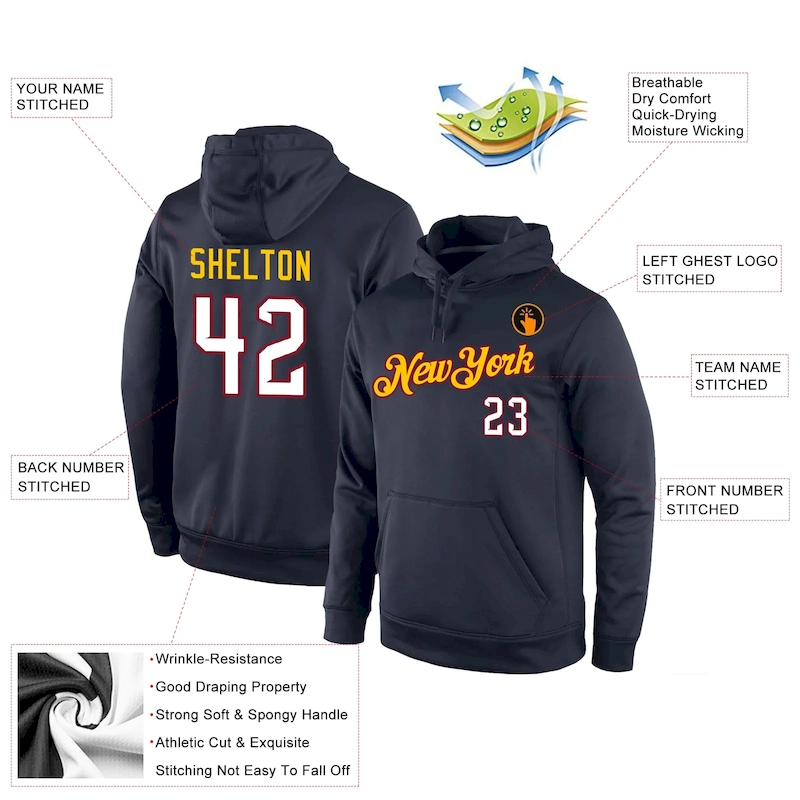 Each ® tailored pullover sweatshirt hoodie is meticulously personalized with the following features:Material: 100% polyesterStitched team or player name and numbersTechnology fleece fabric helps to manage your body’s natural heat to keep you warm Breathable & quick-drying; exquisite stitching not easy to fall offMoisture-wicking fabric has spongy handle, good draping property and elasticity as well as good dimensional stability and wrinkle-resistanceHood with adjustable drawstringMidweight hoodie suitable for moderate temperaturesTagless collarMachine wash, tumble dry low (natural air drying recommended)ImportedNon-alcoholic available for wiping or washing